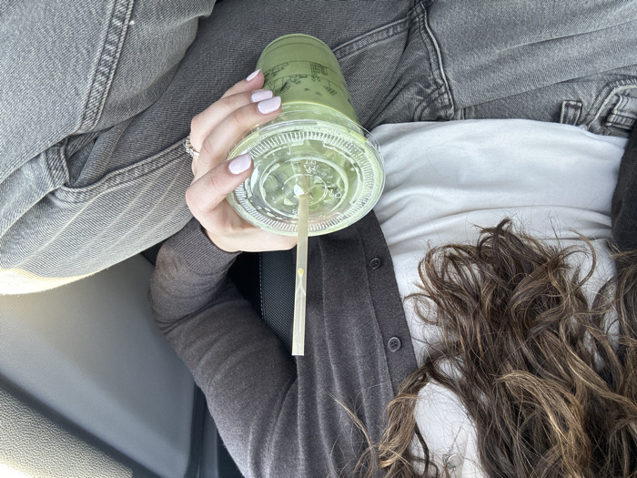 A person is seated, wearing grey jeans, a white shirt, and a charcoal cardigan. They hold a green drink with a straw in their left hand, which has light pink nail polish and a ring. The person's brown curly hair is visible. A portion of the car's interior, including the seatbelt and the door, are visible.