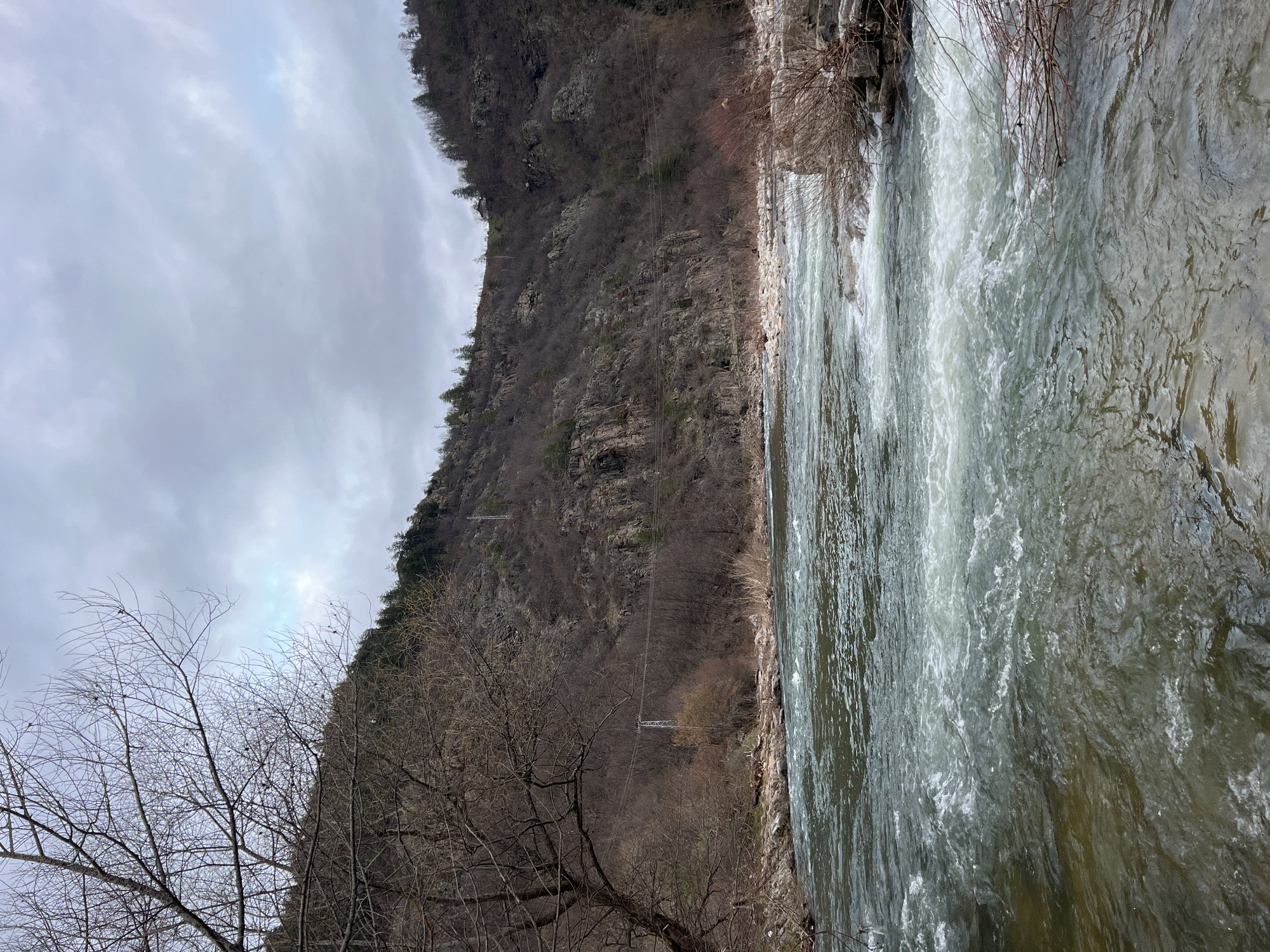river flowing rapidly, with a rocky bank on one side and a steep, wooded hillside on the other. The sky is overcast with heavy clouds. Power lines are visible running across the hillside. Bare trees are in the foreground. The location is Tsirka, Bulgaria.