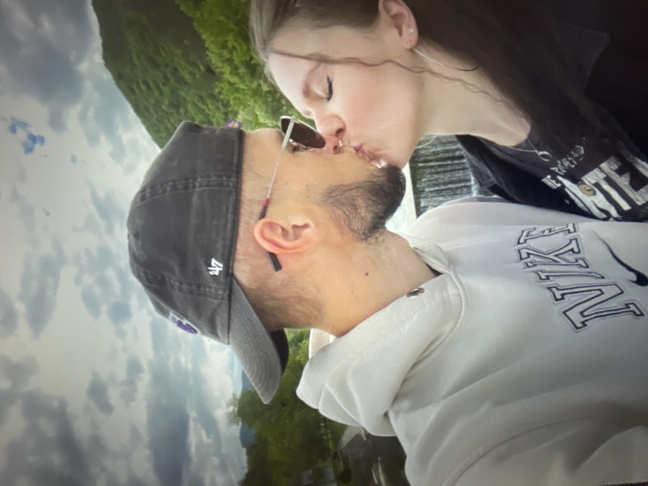 Two individuals are depicted in a close-up outdoor portrait, engaged in a kiss
