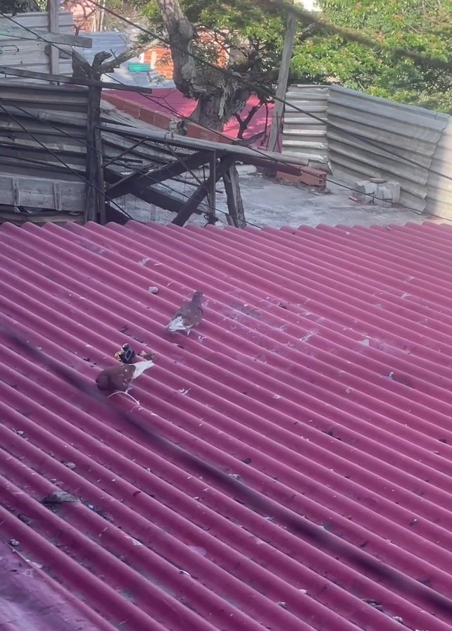two pigeons on a corrugated metal roof. The roof is painted a reddish-purple color. One pigeon is brown with white markings, and it appears to be lying down. The other pigeon is gray and standing upright. There is some debris scattered on the roof. In the background, there is a wooden structure, other rooftops, trees, and a building with red brick. The weather appears to be sunny.