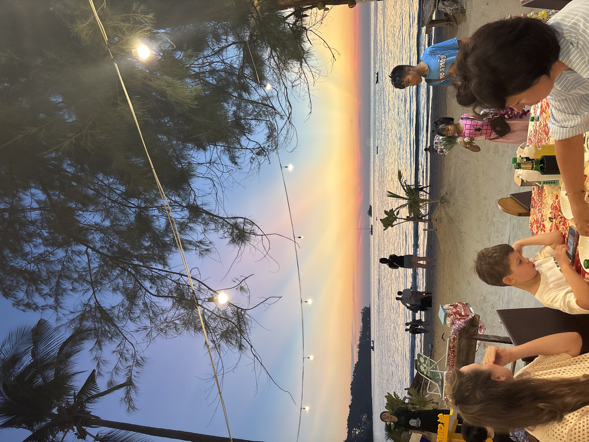 Kamala, Thailand. People dine at tables on a beach at sunset. Other people are walking on the beach. Trees and strung lights are on the left.