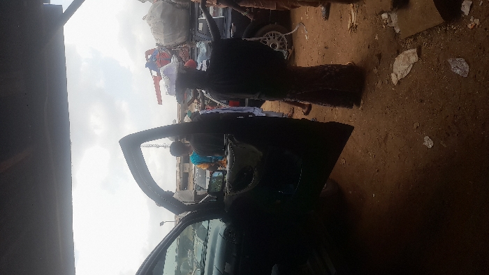 The scene depicts an outdoor environment, likely a market or transport hub, within Nassarawa, Nigeria. The foreground is dominated by a dark-colored vehicle with its front passenger door open, revealing a portion of the interior dashboard and door panel. The ground consists of uneven, reddish-brown dirt with scattered white debris, possibly paper or plastic. In the midground, a person wearing dark clothing and a light-colored, wide-brimmed hat is standing, facing right. This individual carries a flat, circular object on their head and holds a similar object in their left hand, extended towards the right. Their right arm is also extended. Behind this individual, a dark-colored sedan or small SUV is visible, heavily loaded with diverse cargo, including large white bags and a red-orange object, secured on its roof rack. One of its wheels, possibly a spare, is partially visible near the rear of the vehicle. Multiple other individuals are present in the midground and background, partially obscured. One person is visible in a blue and yellow patterned shirt to the left of the hat-wearing individual. The background reveals additional indistinct structures, possibly buildings, under a partly cloudy sky. The upper portion of the image is framed by a dark, solid overhead structure, casting parts of the foreground into shadow.