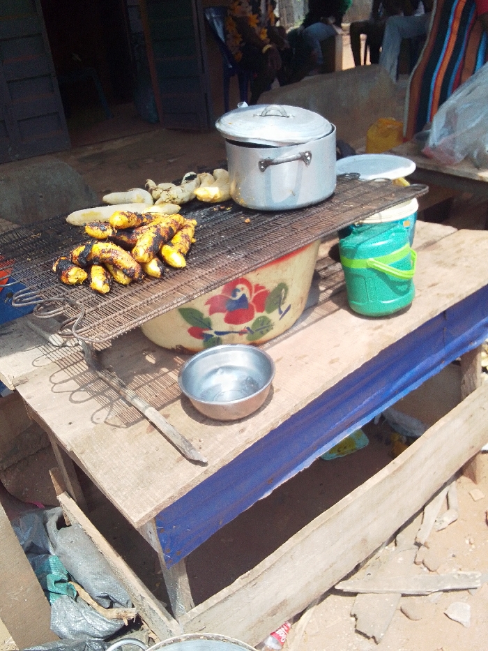 This image displays an outdoor food stall in Nsugbe, Nigeria, under direct sunlight