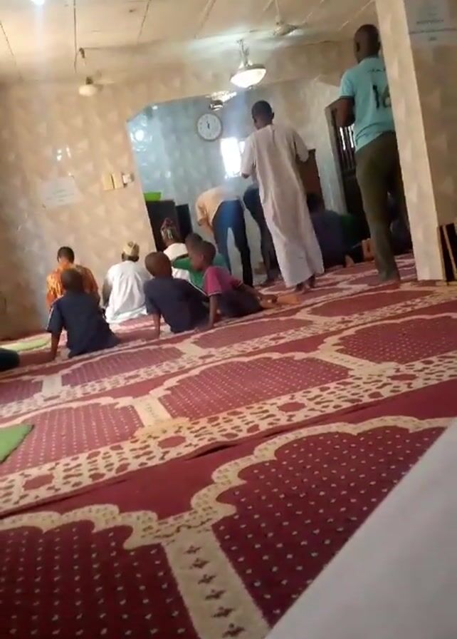 inside of a mosque, with multiple individuals present. Several people are seated on the carpet, which has a red and white patterned design. Others are standing and walking around. Some individuals are wearing traditional Islamic clothing, while others are dressed in casual attire. The mosque has white walls, a tiled section, and several ceiling fans. The video is shot from a low angle.