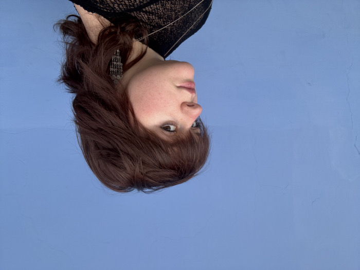 A portrait of a woman with auburn, shoulder-length hair is shown against a light blue background. She has fair skin, freckles, and is wearing an earring. A black, lacey top is visible. Her gaze is directed to the right of the frame. The image is oriented upside down.