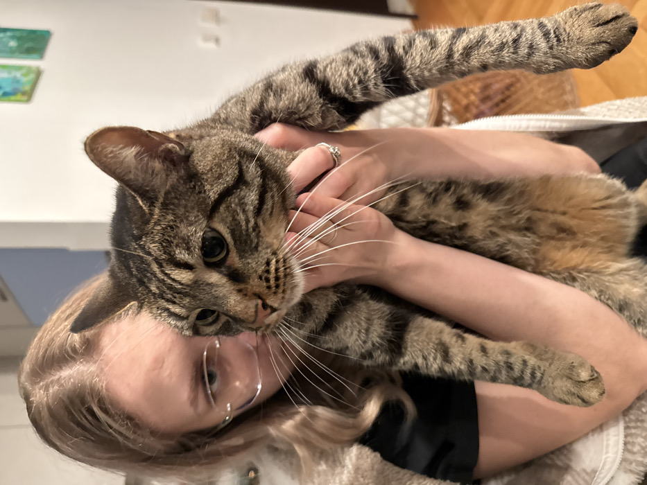 The scene depicts an indoor setting in Boreti, Montenegro. A female individual, partially visible, with blonde hair parted in the center, and wearing clear-rimmed glasses, holds a tabby cat. The cat, predominantly brown with dark stripes and spots, features greenish-amber eyes and prominent white whiskers. It is held vertically, facing right within the frame, with its head slightly turned away from the camera. The female's right hand, visible holding the cat, is adorned with a silver-toned ring on the fourth finger. She wears a dark-colored garment under a light-colored, textured outer layer. The background consists of a white wall, displaying two framed abstract artworks with blue and green coloration. A light-colored floor and a partially visible wicker object are present in the lower right portion of the image. A light switch or outlet is visible on the far right wall.