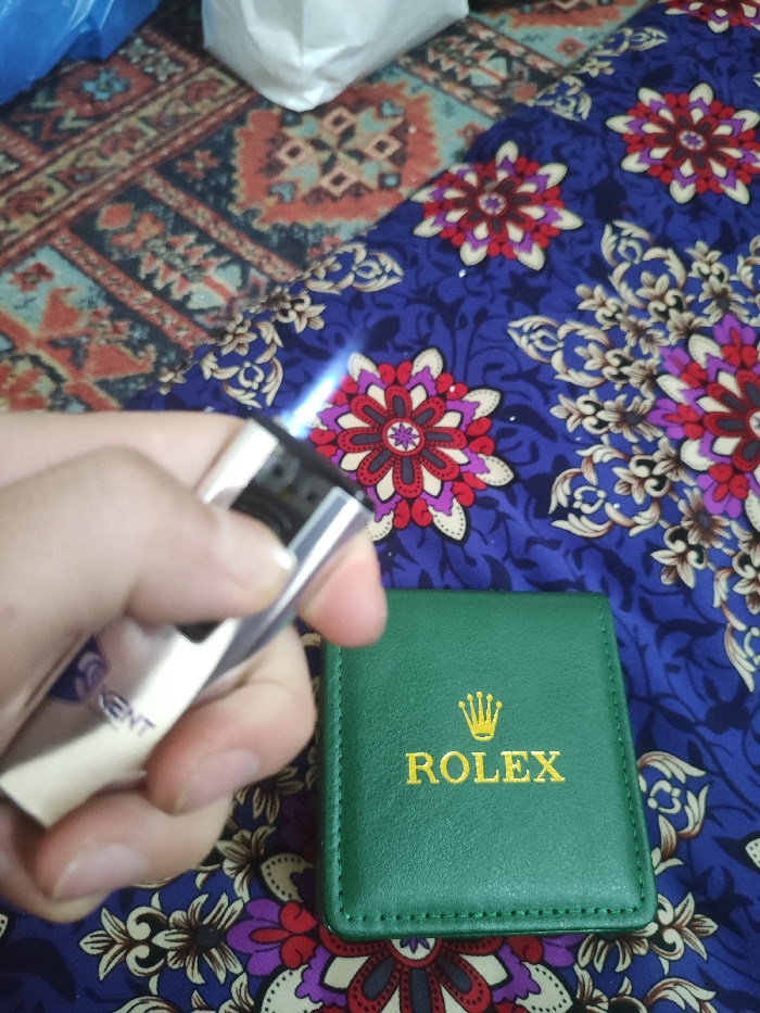 A hand holds a lit lighter, with the word "KENT" visible on its side. Next to it is a green leather box with the word "ROLEX" and a crown logo embroidered in gold. These items are placed on a patterned fabric, featuring floral designs in shades of red, purple, and cream on a blue background. Part of a different patterned rug and a white plastic bag are visible in the upper left corner.