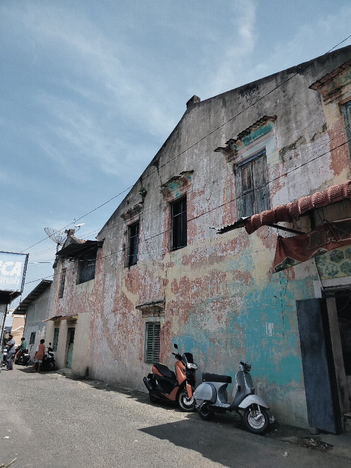 An aged, tall building with peeling paint is the focal point. The structure is flanked by two parked scooters and an orange motorcycle. Windows are interspersed along the weathered facade. In the distance, people are gathered and a sign is partially visible. The scene is illuminated by daylight under a blue sky with wispy clouds.