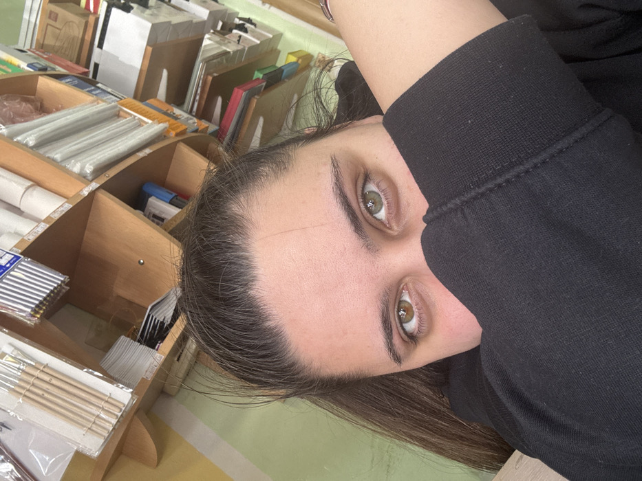 A close-up photograph displays a female subject whose lower face is obscured by her left arm, bent at the elbow and covered by a black long-sleeved garment. Her eyes are directly focused on the camera; the left iris (viewer's left) is brown, and the right iris (viewer's right) is green/hazel, indicating heterochromia. Dark hair is pulled back from her forehead. The background, positioned behind and to the right of the subject, features a multi-tiered wooden shelving unit. This unit is heavily stocked with various art and craft supplies, including multiple sets of paintbrushes with wooden handles in clear plastic packaging, bundles of pencils or pens, rolls of white material, and stacks of paper and cardboard in diverse colors. The setting is identified as a retail establishment, likely an art supply store or stationery shop, located within the city of Sofia, Bulgaria. The specific address of this establishment cannot be determined from the visual information provided.