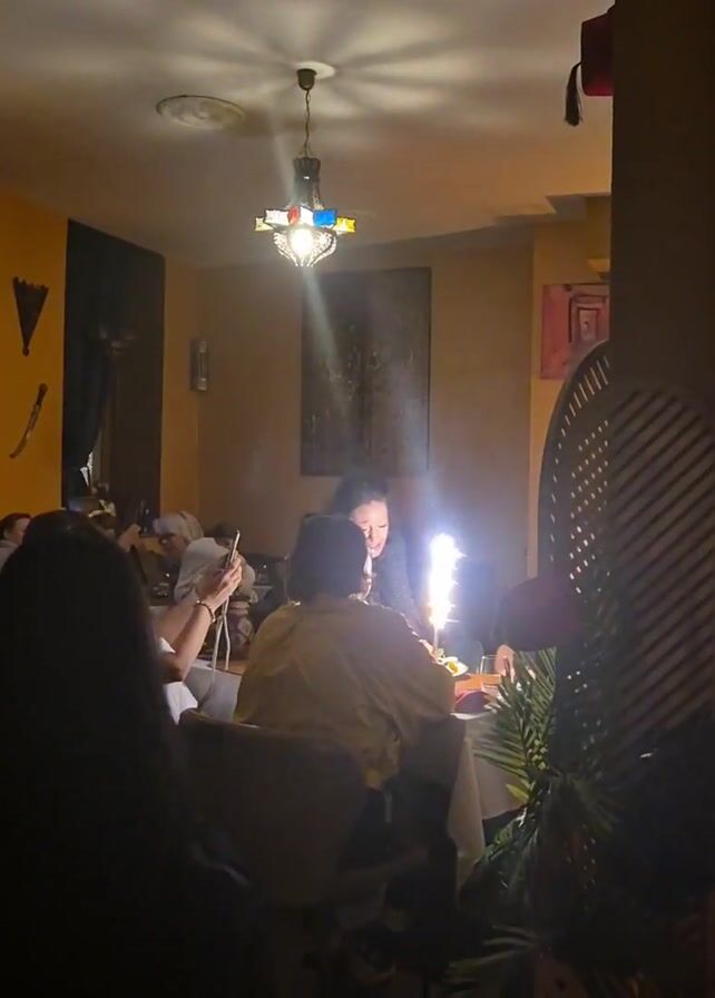 The scene shows a group of people celebrating at a restaurant. They are seated around a table, with a sparkler emitting bright light in the center. A woman stands near the table, seemingly leading the singing of “Happy Birthday”. One person is recording with a phone. The restaurant has an oriental theme, with decorative screens, lamps and other details that hint at Middle Eastern or North African design. The ambiance is warm and celebratory.