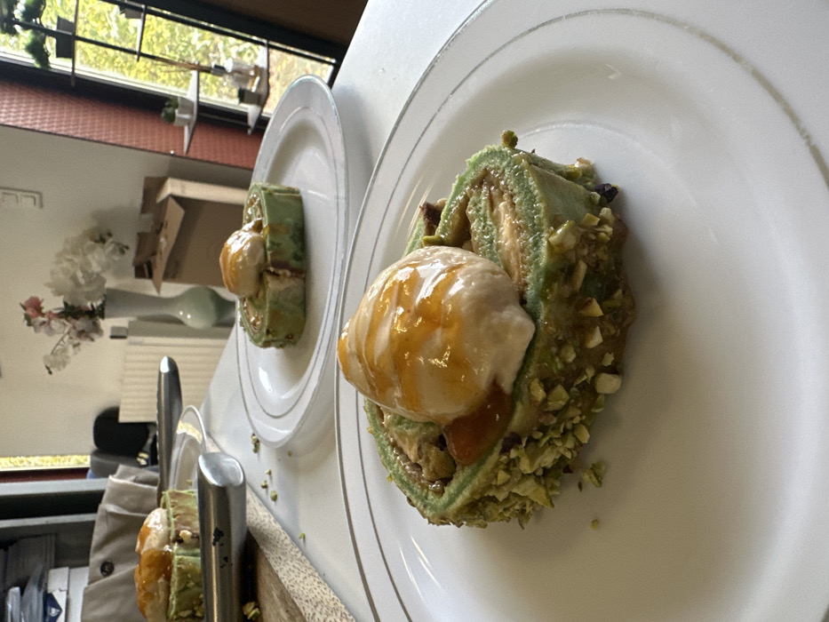 The image depicts an indoor scene in Aubervilliers, France, centered on multiple dessert servings on a white table. In the immediate foreground, a white ceramic plate with a silver rim presents a round, bright green rolled pastry, externally coated with finely chopped pistachios. A scoop of light tan ice cream, topped with a viscous amber-colored syrup, is positioned on the pastry. Fragments of chopped pistachios are scattered across the white table surface adjacent to this plate. Directly behind, a second identical plate holds a similar dessert, slightly out of focus. A silver-handled serving utensil is partially visible to the left of the second plate. The background to the left reveals a light-colored wall, a white radiator, and a beige jacket or coat hanging. The right background features a white vase containing artificial pink and white flowers, a brown cardboard box on the floor, and a tall, dark-framed window. Through the window, blurred green foliage and tiered shelves with small potted plants are discernible. A vertical reddish-brown textured panel is situated next to the window.