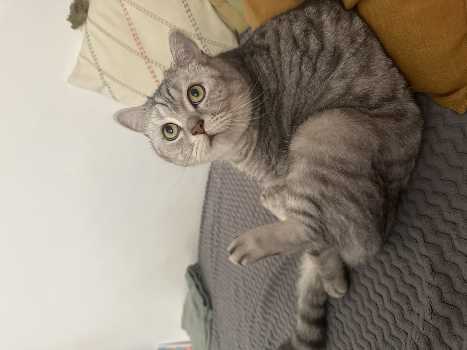 - "The image displays a domestic cat, identified by its silver tabby fur pattern with distinct darker gray stripes and swirls on a lighter gray background, situated indoors on a dark gray blanket" by FM-IgLYH3, licensed under CC BY 4.0