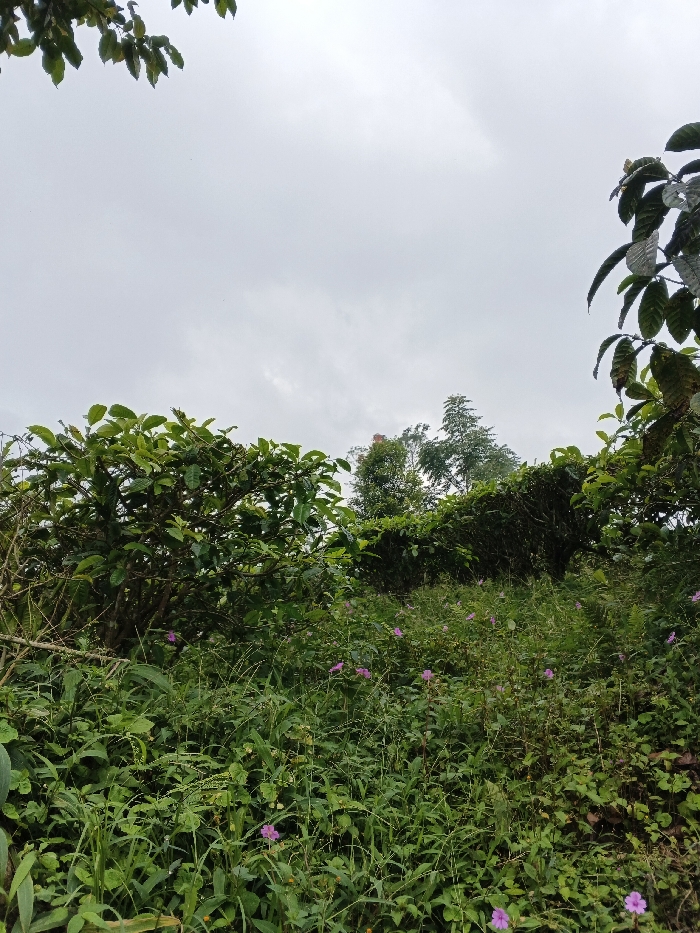 The image displays a densely vegetated outdoor scene under an overcast, light gray sky within the city of Unknown, Vietnam. The foreground consists of varied green ground cover, including grasses and broad-leafed plants, dotted with small pink flowers. In the midground, a line of dark green, bushy shrubs or cultivated plants forms a hedge-like barrier extending across the frame. Taller trees are visible in the background, with a faint reddish-orange structural element partially obscured by foliage. No individuals or overt signs of human activity are present.