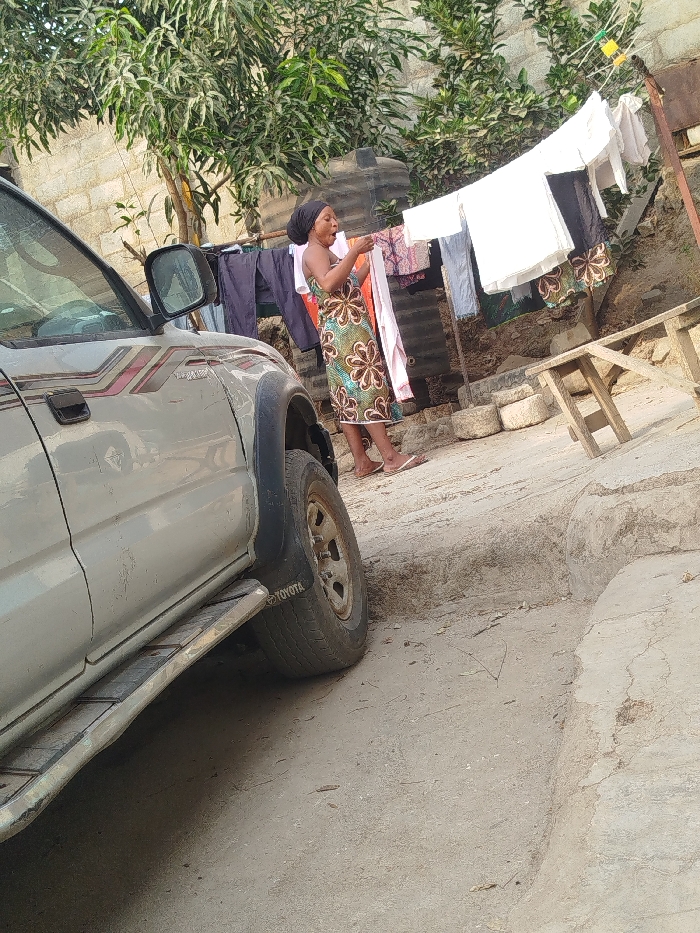 A silver Toyota truck is parked on a cracked concrete surface. Behind it, a woman in a patterned dress hangs clothes on a line. A black water tank is visible behind the line. A small wooden table sits to the right of the clothesline, and a brick wall is in the background. Trees provide a backdrop. The scene appears to be in a residential yard or driveway.