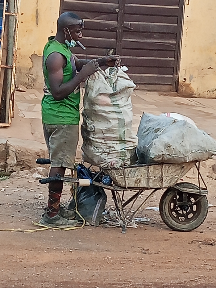 A man stands next to a heavily loaded wheelbarrow. He wears a green tank top, khaki shorts, and patterned socks. A cigarette or cigar is in his mouth. The wheelbarrow contains two large, gray sacks. A smaller blue bag hangs off the side. The ground is red dirt and a yellow cord lies near the wheelbarrow. A building with a barred door is in the background.