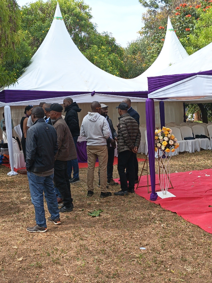 Several people gather outside under white tents with purple trim. A red carpet leads toward white chairs. A floral arrangement sits atop a white, abstract stand. The ground is covered in dry grass and leaves. Trees with green leaves and red flowers are visible in the background. The scene suggests an outdoor event, such as a wedding or celebration.