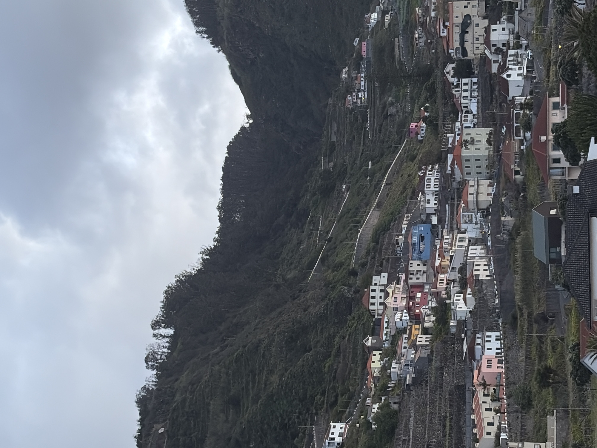 view of the village of Seixal in Porto Moniz, Portugal. The village is nestled on a steep hillside, with terraced fields and dense vegetation surrounding the colorful houses. The sky is overcast. The village architecture consists mainly of two-story homes with white walls. The roads are narrow and winding, connecting the different parts of the village. There are no people visible.