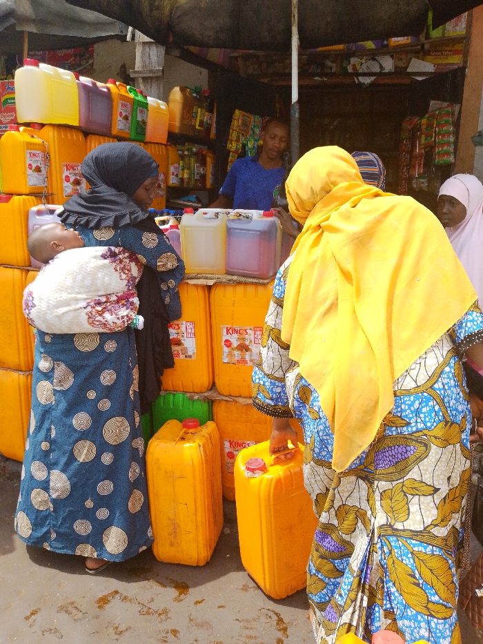 The image depicts an outdoor market stall in the city of Bukuru, Nigeria. In the foreground, two women interact with a vendor. A woman on the left wears a dark blue and cream patterned dress with a black headscarf, carrying a baby swaddled in a white and red patterned cloth on her back. She faces right, observing the interaction. A second woman on the right, clad in a blue, white, and yellow patterned dress with a bright yellow headscarf, is partially turned away from the viewer. She is actively holding the red-capped handle of a bright orange plastic jerrycan positioned on the ground. In the background, a male vendor in a blue patterned shirt stands behind a counter, looking towards the woman on the right. To the far right, a fourth person, a woman in a pink head covering, is partially visible. The stall is surrounded and defined by numerous bright orange plastic jerrycans, many bearing "KING'S" labels, stacked horizontally and vertically. On the counter, three smaller, transparent plastic jerrycans contain different colored liquids: two light yellow/clear and one reddish-purple. Shelves in the upper background display various packaged goods. The ground is a dark, stained surface, consistent with concrete or asphalt, and a dark tarp or canopy covers the stall overhead.