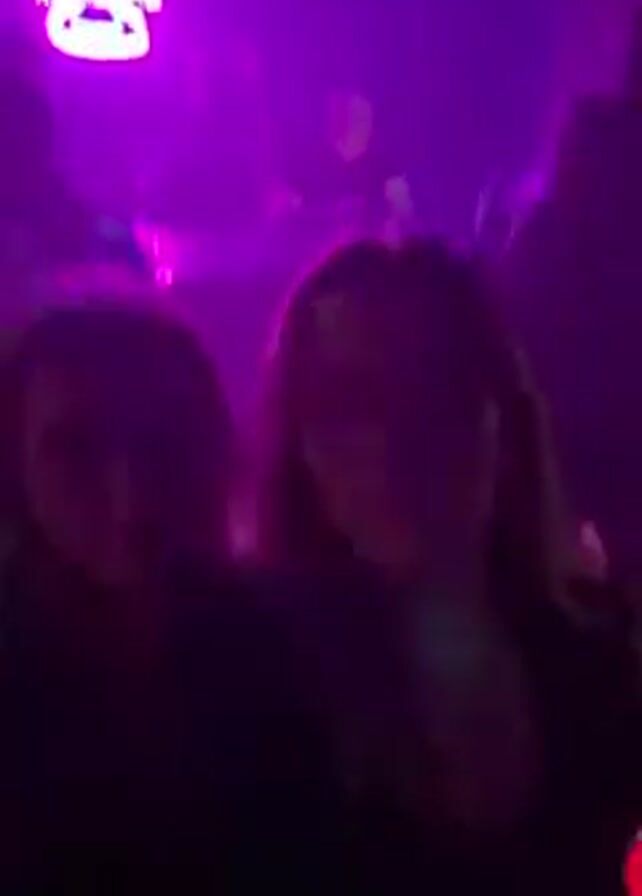 Two fair-skinned women stand close together in a dimly lit space. The woman on the left has light blonde hair and is not wearing glasses; the woman on the right has light brown hair and wears eyeglasses. Both appear to be looking toward the camera. A bright neon sign in the shape of a hookah is visible in the background, along with linear green lights. The purple light from the neon sign permeates the entire space, and silhouettes of other people can be seen in the background.