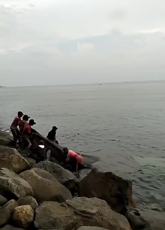 A group of at least six people work together to haul a large net out of the water and onto a rocky shoreline