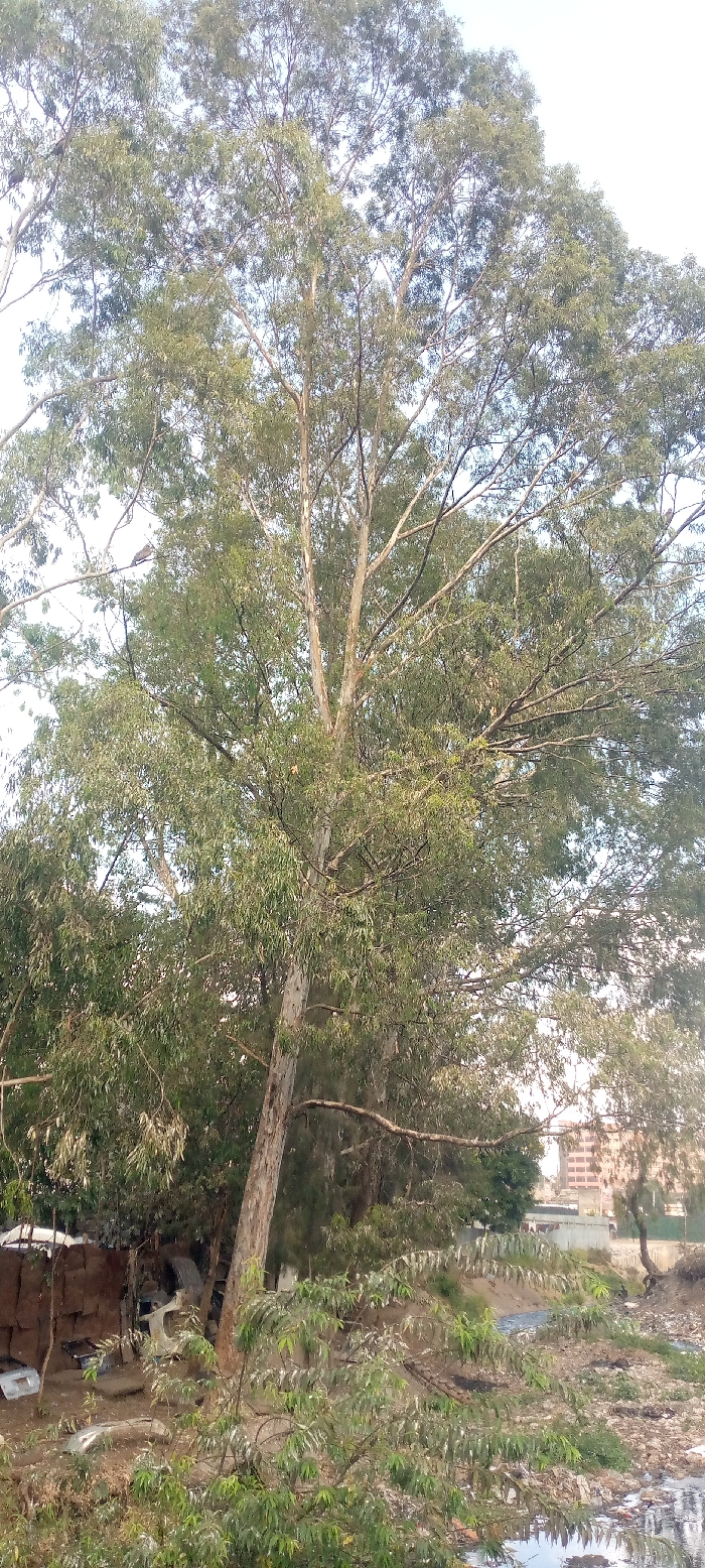 The image portrays an outdoor scene within Thika Township ward, Kenya. A tall, slender tree with light-colored bark and dense green foliage, likely a eucalyptus species, dominates the central and upper frame, extending against a light, hazy sky. A dark-colored bird is perched on a branch in the upper left quadrant of this tree. Below, a narrow, dark-colored waterway, appearing as a stream or drainage ditch, occupies the lower-center and right, flowing between banks that are heavily polluted with various forms of refuse, including plastic bags, bottles, and other discarded materials. The banks themselves are steep and show signs of erosion. On the left side, at ground level, a roughly constructed brown wall or barrier, possibly made of packed earth or mud bricks, is visible. Behind this wall, additional metallic and plastic debris is scattered, notably a white, curved object resembling a scooter panel. In the distant background on the right, beyond intervening trees and a concrete wall, several multi-story buildings with reddish facades are faintly discernible under the hazy sky, indicating an urban environment. No human figures are present.