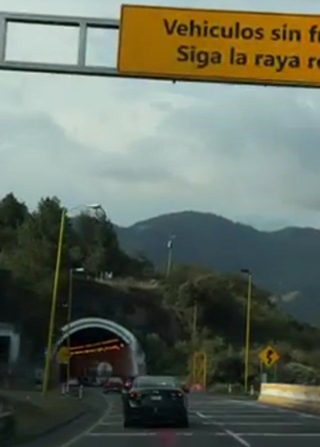 A car is driving on a highway towards a tunnel. There is a sign overhead that reads "Vehículos sin freno. Siga la raya roja." The landscape is mountainous and the sky is overcast.