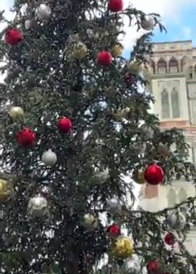 decorated Christmas tree with red, gold, and silver ornaments. The tree is located outdoors in front of a large, ornate building with statues, arched windows, and a large rose window. The sky is blue with some clouds. The video pans upwards to show more of the building.