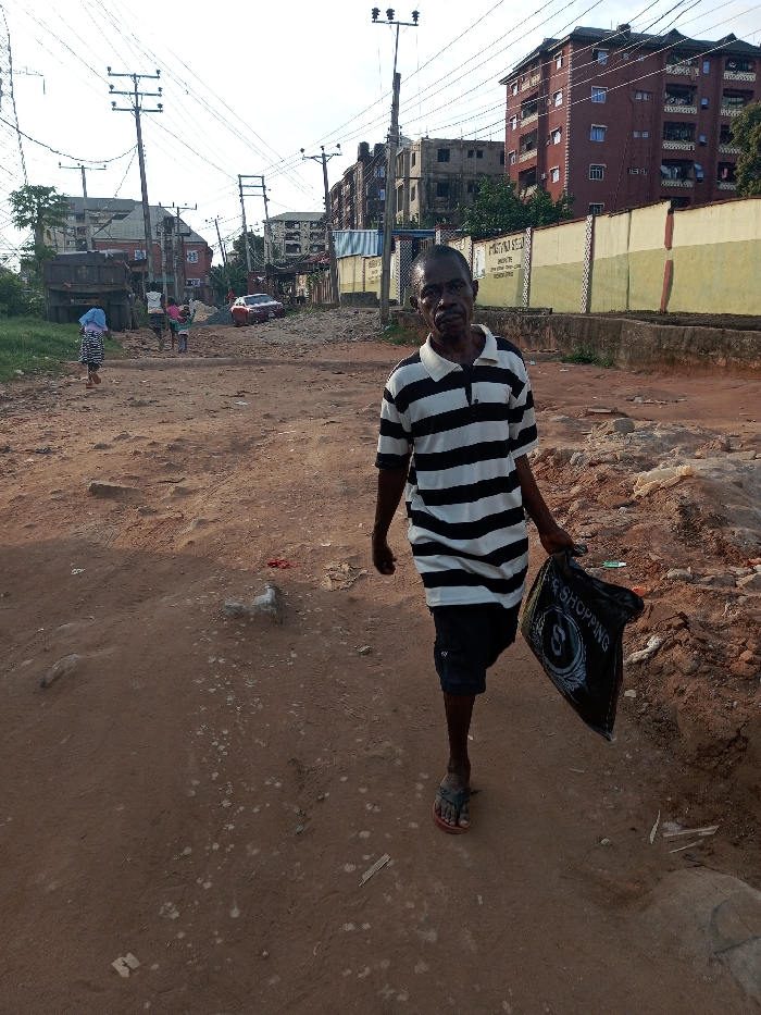 The image displays an unpaved street in Obosi, Nigeria, under natural daylight. In the foreground, an adult male with dark skin, short dark hair, and light facial hair, wearing a black and white striped polo shirt, dark shorts, and dark flip-flops, walks towards the viewer's left. He is looking directly at the camera and holding a black plastic shopping bag with white lettering in his left hand. The road surface is reddish-brown dirt, uneven, with visible rocks, mounds, and debris. In the mid-ground to the left, a woman wearing a light blue head covering and at least two other individuals walk away from the camera on the unpaved road. A dark dump truck is stationary on the far left. Further down the road, a red sedan is visible. The background includes multiple multi-story buildings: a reddish-brown apartment building with balconies on the right, adjacent to a wall painted light green over dark green, bearing white text. Other buildings in the mid-distance appear to be under construction or in disrepair. Numerous wooden utility poles with extensive overhead electrical or communication wires are prominent across the sky. Sparse green vegetation is present on the left roadside.