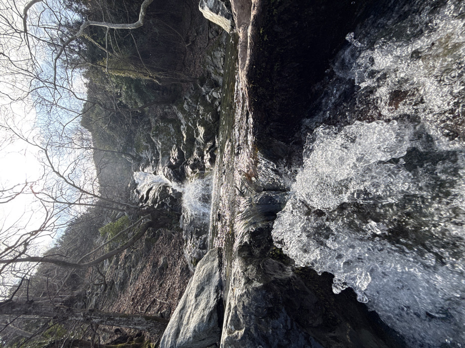 This image depicts a natural, multi-tiered waterfall and a rocky stream in Therma, Greece. The foreground features turbulent, aerated water vigorously cascading over dark, submerged rocks, creating white foam and splashes. Immediately behind this, the stream flows over a series of dark, irregular boulders, forming small pools and additional minor cascades. The main waterfall in the midground descends a steep, rocky incline, its path carved through grey and dark-toned rocks. The surrounding environment consists of a densely wooded hillside on both sides, with numerous deciduous trees displaying bare, gnarled branches, indicating a leafless season. Some patches of evergreen foliage are interspersed among the bare trees, particularly on the right. The ground on the slopes is covered with fallen brown leaves. Bright sunlight filters through the upper tree canopy and directly illuminates the upper sections of the waterfall and the water's surface, creating prominent highlights and a lens flare effect in the upper center. No human presence, animals, or artificial structures are visible.