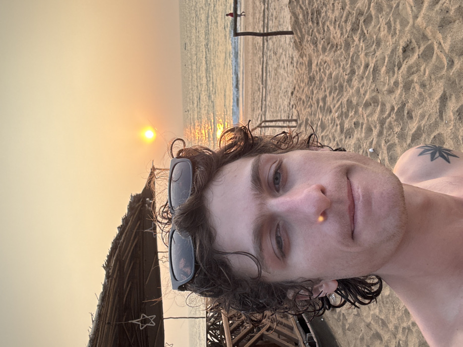 The image depicts a male individual taking a selfie on a sandy beach during sunset in Sinquerim, India. The foreground is dominated by the male subject, who has light skin, blue eyes, and dark, wet, curly hair. He wears dark-framed sunglasses positioned on top of his head and is shirtless, revealing a black, star-shaped tattoo on his left shoulder. His gaze is directed towards the camera, and his mouth is closed in a neutral expression. In the midground, to the left, a structure consistent with a beach shack is visible, featuring a thatched roof supported by wooden beams. White, star-shaped decorative lights hang from this structure. To the right, two dark wooden posts are partially driven into the sand. The background displays the Arabian Sea under a clear sky, with waves breaking near the shore. The sun, a distinct orange orb, is positioned near the horizon, casting a bright, golden reflection across the water and illuminating the scene. A small, indistinct human figure is visible walking along the waterline on the right side of the frame. The beach sand exhibits numerous footprints.