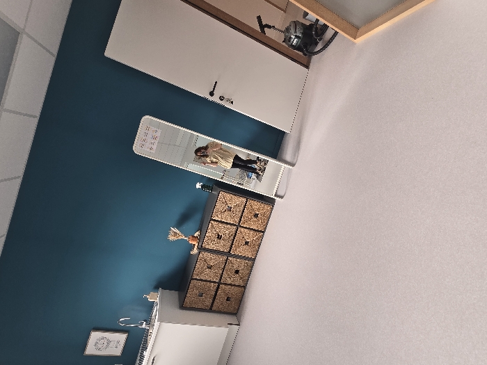 This image presents an interior view of a room, situated in the city of Mouscron, Belgium, captured with a noticeable upward and rightward tilt. The environment features a prominent teal-colored wall and a light grey, smooth floor. A white drop ceiling with grid panels is visible at the top. On the left, a white base cabinet with a light-colored countertop contains a stainless steel faucet and a partially visible sink basin. A white pump-action soap dispenser rests on the counter. Above this unit, a white-framed picture with a black, abstract illustration and illegible text is mounted on the teal wall. Adjacent to the countertop, a dark-colored storage unit is present, featuring six woven wicker basket drawers arranged in a 2x3 grid. On its top surface, a small light-colored pot holds dried beige botanical material, and a dark spray bottle is positioned nearby. Towards the center-right, a white-framed full-length mirror leans against the teal wall. The mirror reflects a female individual, presumed to be the photographer, wearing a light-colored short-sleeved top and dark pants. She is holding a smartphone with both hands, making a peace sign gesture with the fingers of her right hand. Several small white notes are affixed to the top of the mirror. On the far right, a white interior door with a black handle and lock mechanism is visible, set within a light-toned wooden frame. An industrial wet/dry vacuum cleaner, identifiable as Kärcher brand with a dark body and yellow/green accents, is situated on the floor next to the door. A partial view of a light wooden frame, possibly another mirror or picture frame, is visible in the extreme lower right foreground.