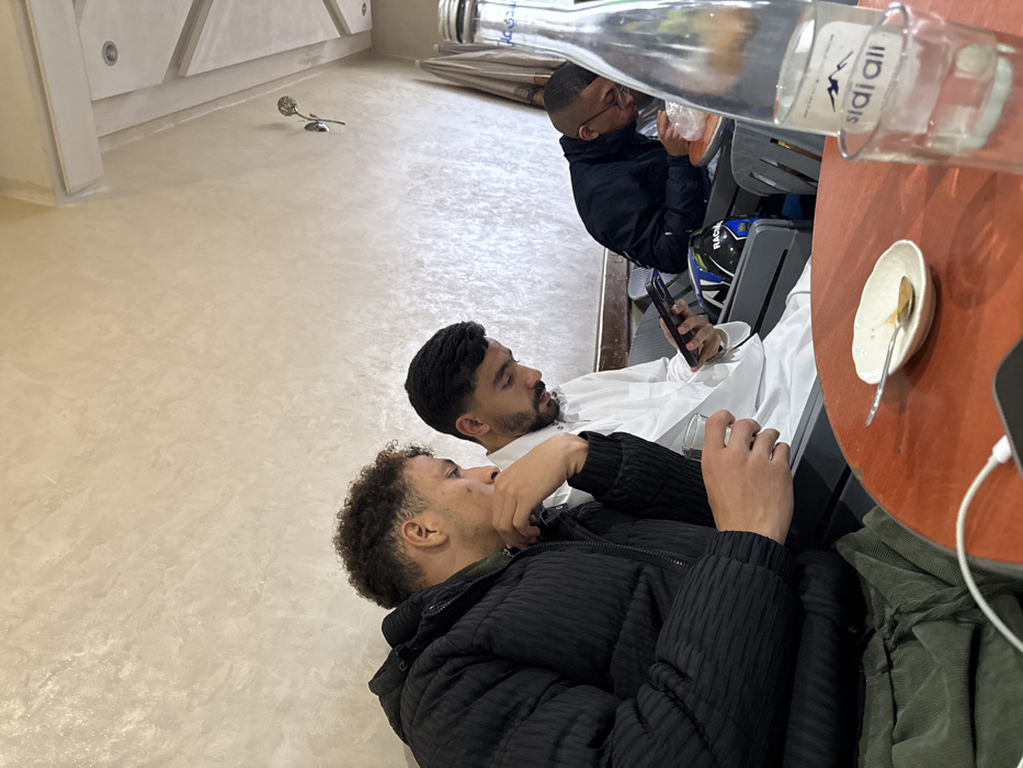 Three men are sitting at a table. One man wears a white thobe and is looking at his phone. Another man is in a black puffer jacket. A third man is wearing a black jacket and eating food. A bottle of water is on the table near a plate with a spoon. A helmet and a phone are also visible. The scene is likely a casual gathering or meal at a cafe or restaurant.