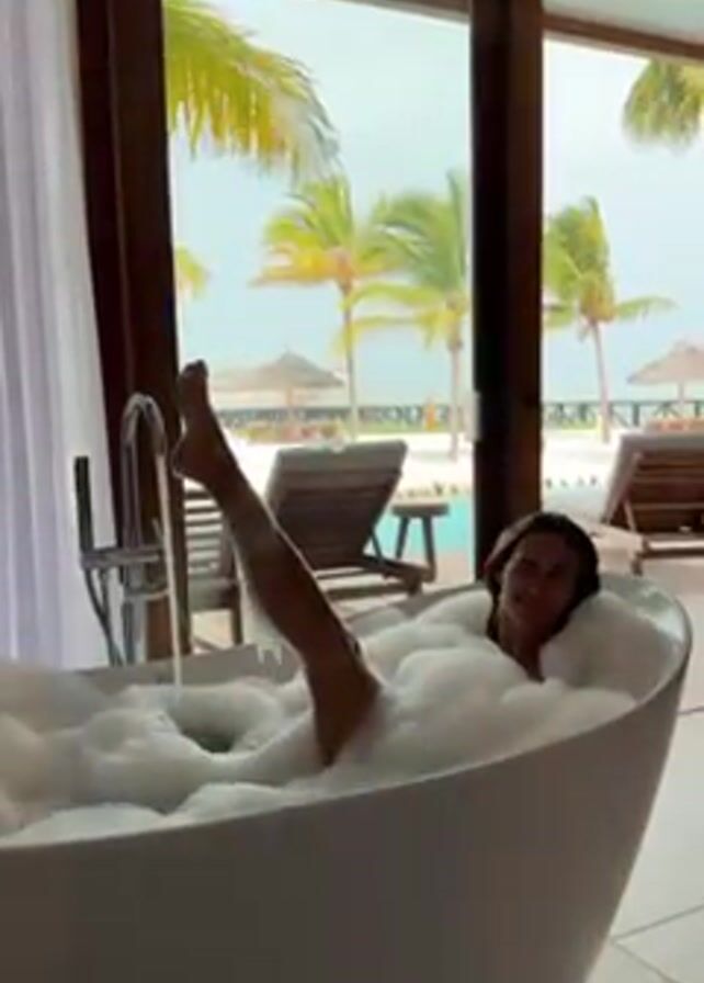 A woman is in a white oval bathtub full of bubbles. She is smiling and speaking to the camera. One of her legs is briefly raised in the air. Through a large window, a resort can be seen, including palm trees, lounge chairs, a swimming pool, and umbrellas on the beach.