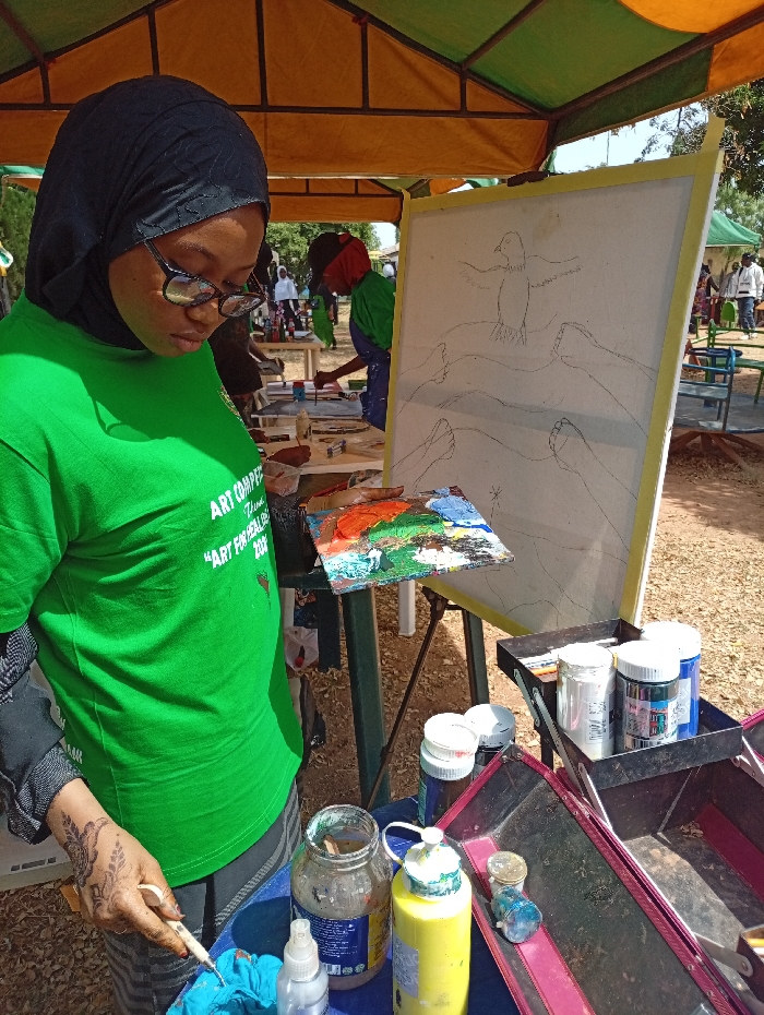 An outdoor art competition is underway in Unguwar Shanu, Nigeria, under a green and orange striped canopy providing shade on reddish-brown earth