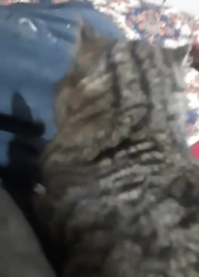 cat from the back, sitting or lying on someone’s lap. The cat is grey and black with tabby markings. Behind the cat is a bed with a dark blue sheet and a colorful paisley-like patterned blanket. Part of a red blanket is also visible. The camera is slightly unsteady, causing minor blurring.