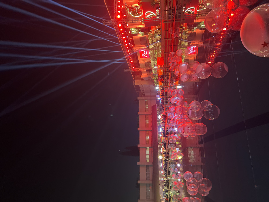 A nighttime cityscape is illuminated with red lights and spotlights, casting beams across the dark sky. A tall building is adorned with rows of clear, spherical ornaments. The lights highlight architectural details and reflect off the decorations, creating a festive ambiance. The scene is captured from a low angle, emphasizing the height of the building and the expansive sky.