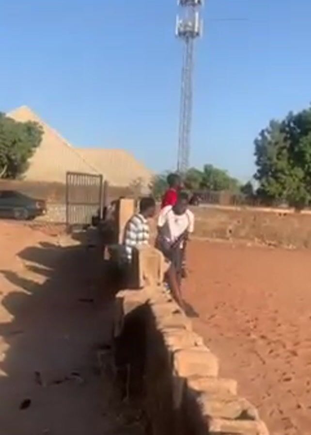 Several young men are seen near a low, cinder block wall, with a large sandy area on the other side. One young man walks confidently forward, smiling. He is wearing a white t-shirt, dark shorts, and carrying a dark bag. Behind him, another young man in a red shirt stands, and another in a plaid shirt sits on the wall. A tall communication tower is visible in the background. There is also a building with a pointed roof and a gate visible in the background. The sky is clear and blue.