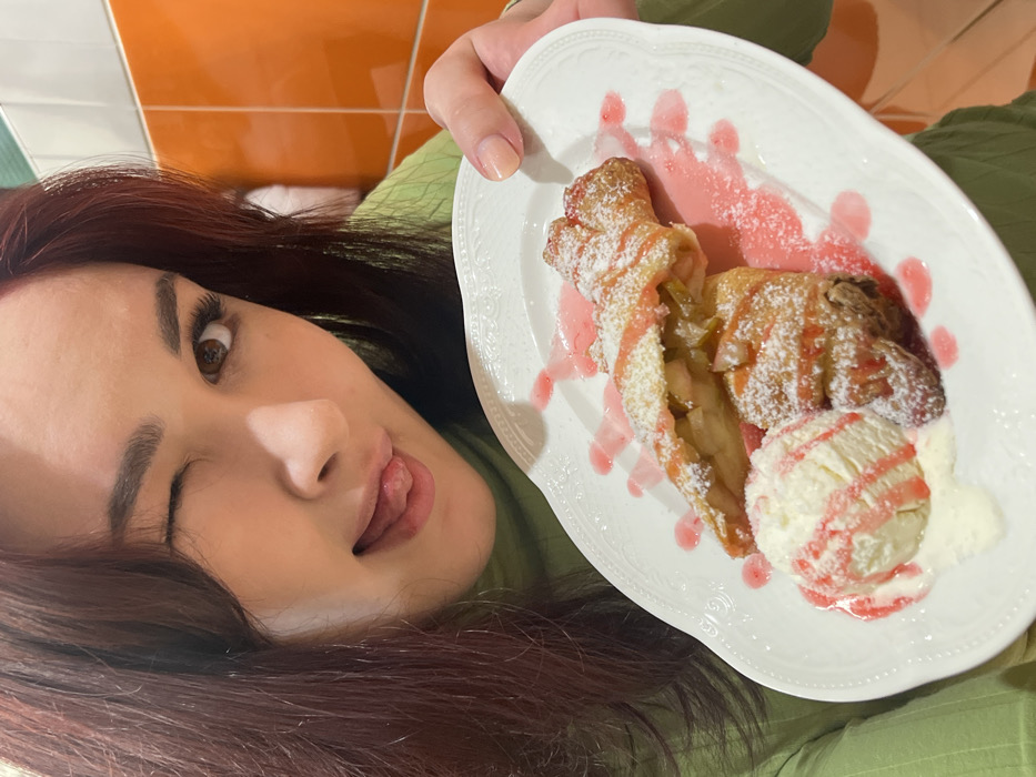 A female individual is depicted in a close-up, chest-up portrait shot taken in Neftekamsk, Russia. She has long, dark brown hair and wears a light green, high-neck garment. The subject winks with her right eye and slightly extends her tongue while looking directly into the camera. Her left hand, visible with manicured fingernails, holds a white rectangular plate featuring an embossed decorative edge. On the plate, two pieces of pastry, identified as likely apple strudel, are dusted with powdered sugar and drizzled with a reddish-pink syrup. Alongside the pastry is a scoop of vanilla ice cream, also topped with the same syrup. The background reveals a tiled wall consisting of a top row of light green/teal rectangular tiles and a bottom row of orange rectangular tiles, arranged horizontally with a visible grout line separating them.