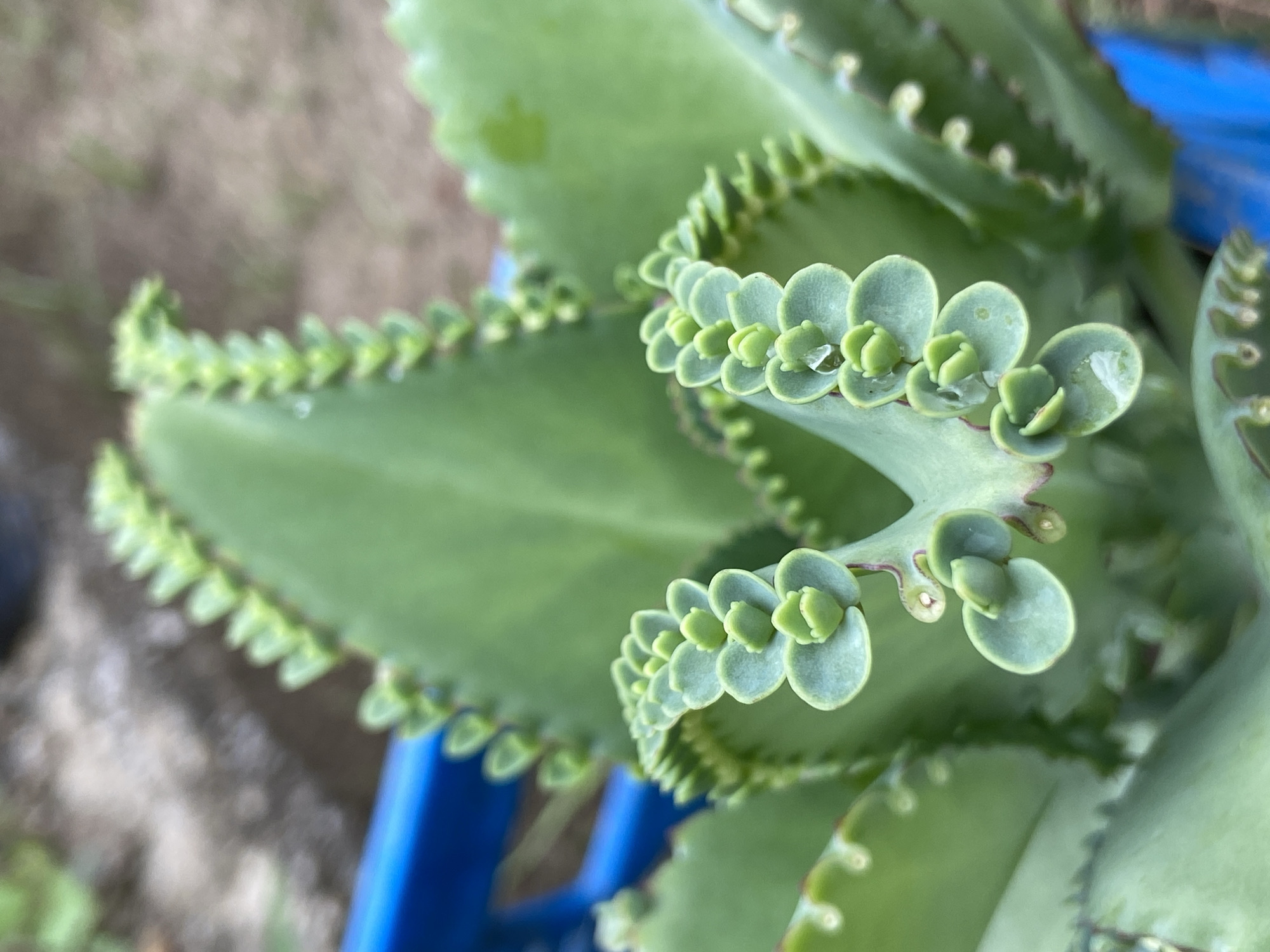 close-up view of a "Mother of Thousands" plant (Bryophyllum daigremontianum), characterized by its fleshy, green leaves with plantlets growing along the edges