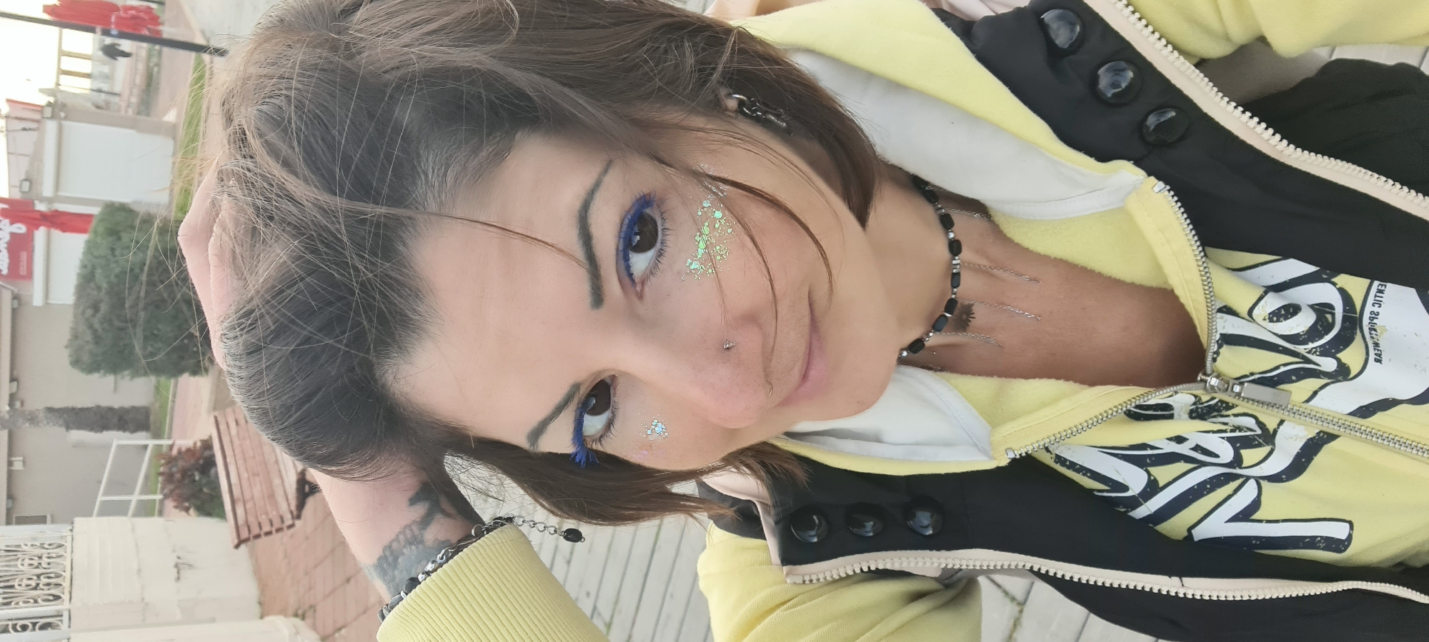 A woman poses outdoors. She has brown hair and fair skin, with blue eyeliner and glitter around her eyes. She is wearing a yellow hoodie with black accents and a graphic design on the front. A necklace is visible around her neck. She is holding her head with her hand, revealing a tattoo on her wrist. In the background, a bench and some greenery are partially visible. A building with red umbrellas is also in the background. The location is in Nahariyya, Israel.