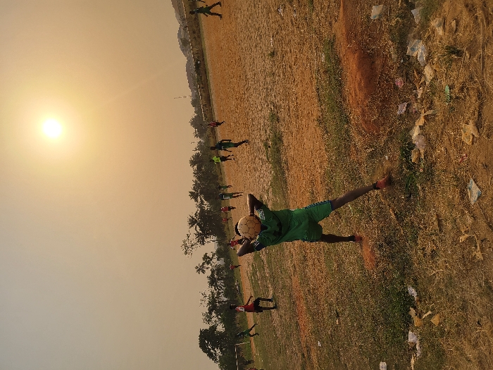 A soccer field is captured during golden hour. A player in green shorts and jersey balances a soccer ball on his head. Other players are scattered across the field. A few trees are visible in the background. Trash is strewn on the field's edges. The sunset casts a warm glow over the scene.