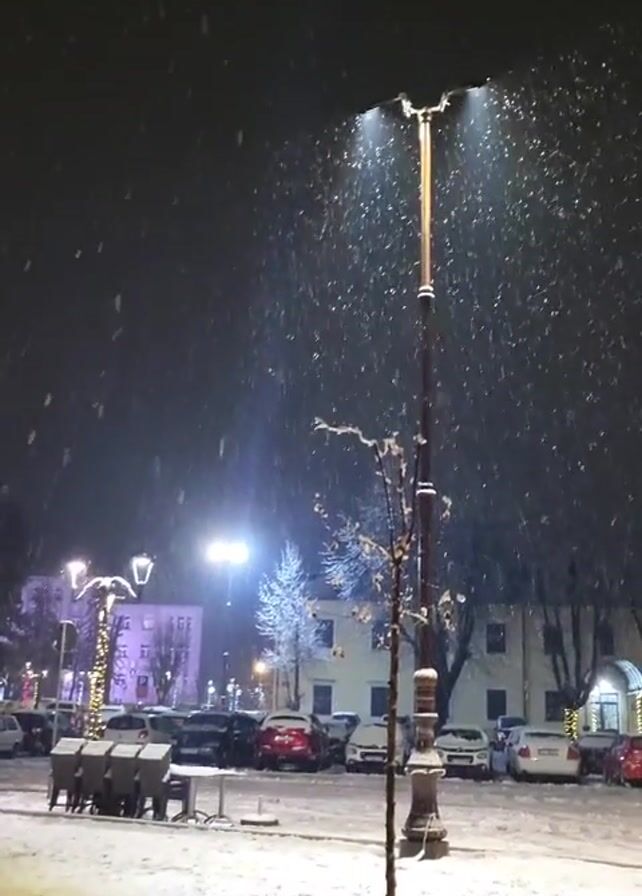 A person is filming a street scene at night in snowy weather. There is a lamppost in the foreground. In the background, there are cars parked in a snow-covered parking lot, and buildings with Christmas lights.