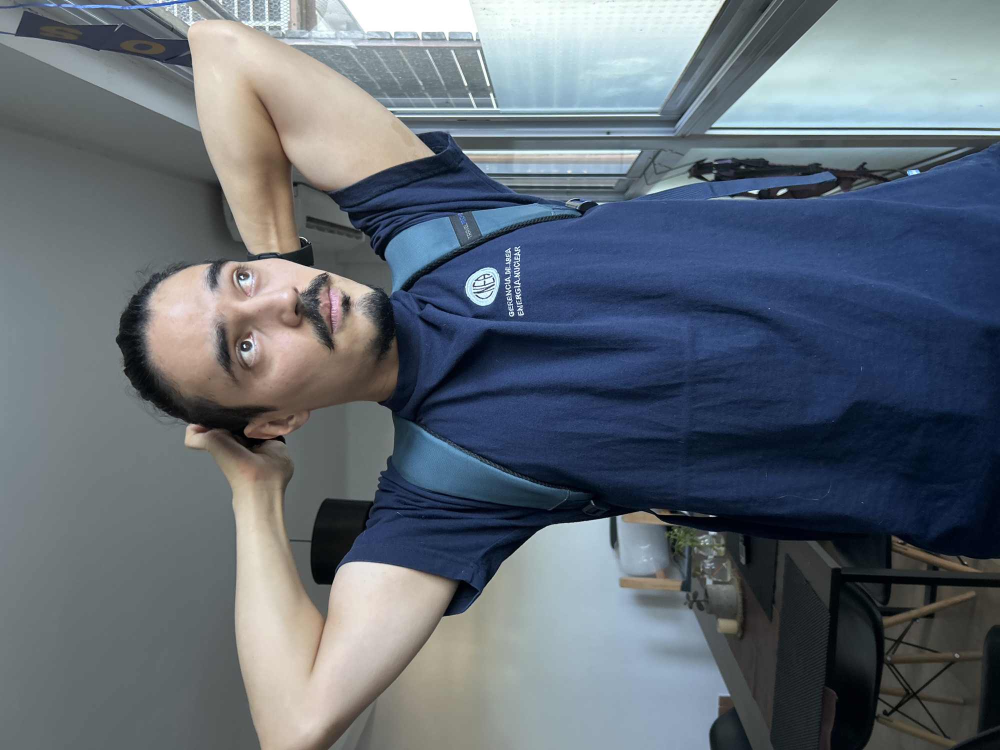 An adult male subject is depicted indoors in Villa San Andrés, Argentina. He has medium skin tone, dark hair styled in a bun, a prominent mustache, and a short beard. He wears a dark blue short-sleeved t-shirt with a light blue circular logo on the left chest that reads "CNEA GERENCIA DE AREA ENERGIA NUCLEAR." A teal-colored backpack with a "TRAVELTECH" tag on the strap is worn over his shirt. The subject is standing with both arms raised, hands placed behind his head, and his gaze directed upwards and to the right, looking through a multi-pane window. The window appears to open to an exterior with partial obstruction from a metal grate and reflects bright natural light. Blue and yellow paper decorations are visible near the top right window frame. To the left of the subject, a dining area is visible, featuring a dark rectangular table with black chairs, a dark cylindrical ceiling light fixture, and potted plants/decorations on the table. The walls and ceiling are light-colored.