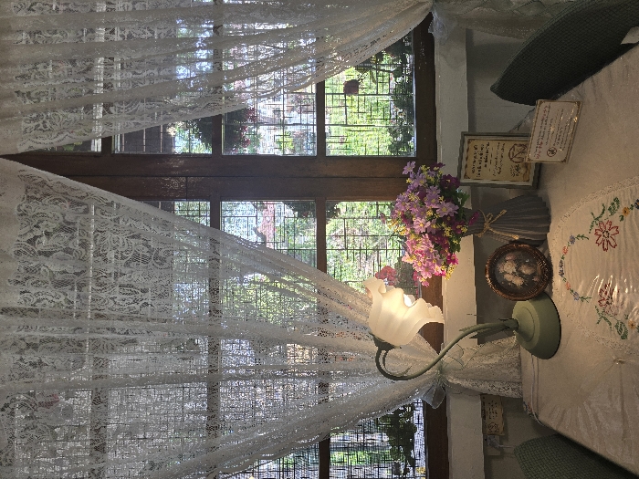An interior scene located within Chiang Mai City Municipality, Thailand, features a table positioned directly in front of a wooden-framed window. The window is adorned with white, intricately patterned sheer lace curtains, partially drawn to reveal an exterior view of lush green foliage, trees, and visible portions of distant structures through a metal security grille. Sunlight illuminates the scene from the outside. On the table, covered with a light-colored tablecloth and an embroidered runner displaying a floral pattern, several items are arranged. From left to right: an illuminated table lamp with a curved, light-green painted stem and a white, fluted glass shade; a small, round, dark-framed picture (possibly a photograph of flowers); a grey, ribbed vase wrapped with twine at its neck, containing an arrangement of artificial flowers in shades of pink, purple, and yellow; a rectangular framed sign displaying text, standing upright; and a smaller, clear plastic or acrylic sign with white text on a gold background, placed horizontally in front of the larger sign. Portions of two chairs with light-green patterned fabric backrests are visible on either side of the table. No people are present.