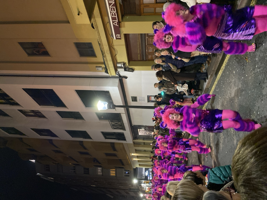 A street parade featuring numerous individuals costumed in vibrant purple and pink outfits, many wearing matching wigs. Spectators line both sides of the street, watching the procession. Buildings are visible in the background, illuminated by streetlights, and some have signage, including one reading "ALBENIZ". The scene seems festive and lively, captured during an evening event.