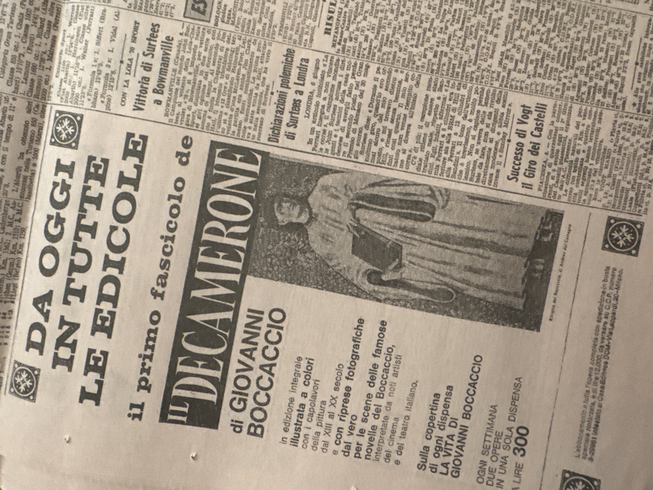 - "The image is a clipping from an Italian newspaper, featuring an advertisement for a publication of Giovanni Boccaccio's "The Decameron" by FM-yCiPo1, licensed under CC BY 4.0