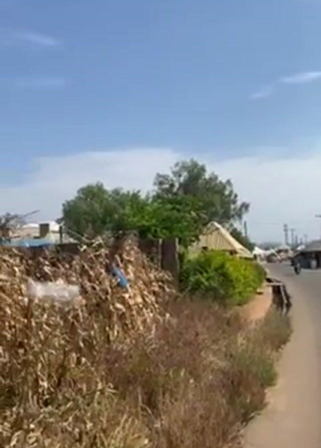 street scene on a sunny day. The road is paved and stretches into the distance. On the right side, there are residential buildings with corrugated metal roofs. Power lines run along the street. A motorcycle and a tricycle are moving along the road. The sky is blue with some clouds. The environment appears to be a suburban or semi-rural area. The camera is stationary.