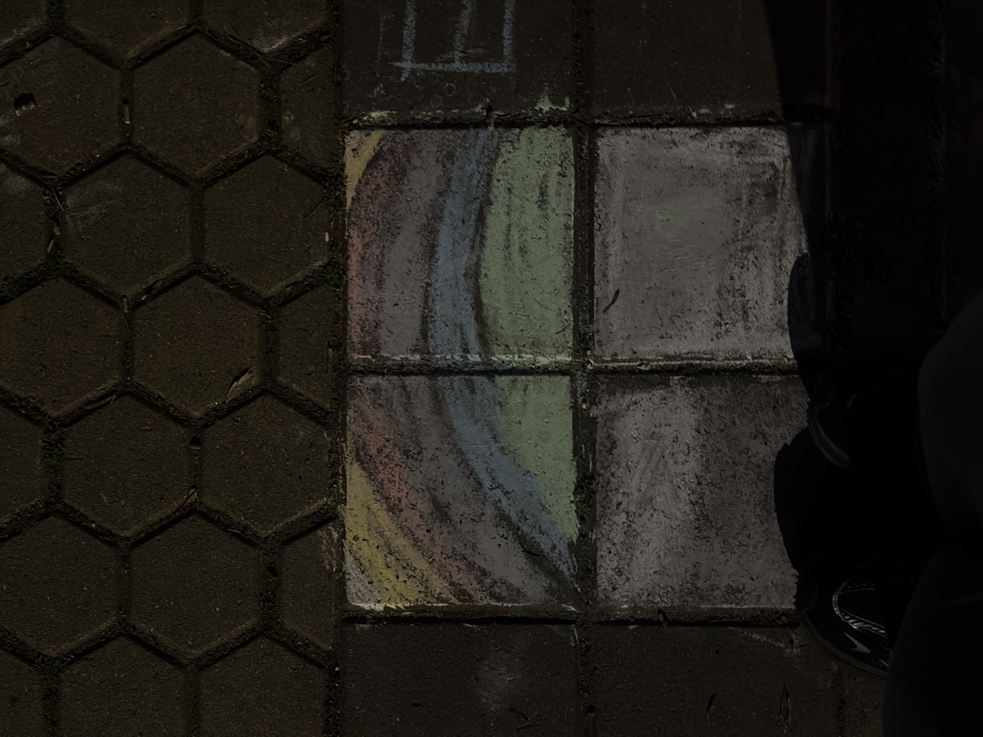 section of pavement with two different paving patterns. On the left are hexagonal pavers, and on the right, square pavers. There is a drawing on the square pavers, created with what appears to be colored chalk. The drawing is an incomplete rainbow, with bands of yellow, pink, blue, and green visible. Part of a person is visible on the right of the image. The pavement and drawing are in shade. I cannot determine the specific location in Sofia, Bulgaria, based on the image alone.