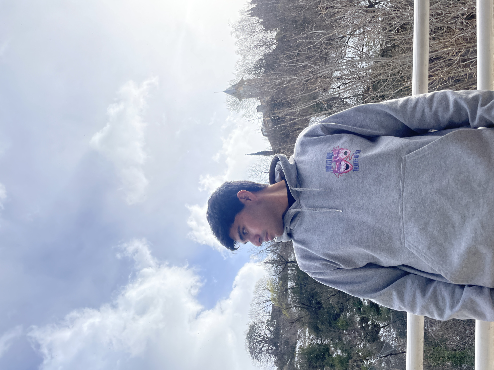 A young man wearing a grey hoodie with the logo "MOOLE DODE THEATRE OF FOOL" stands outdoors