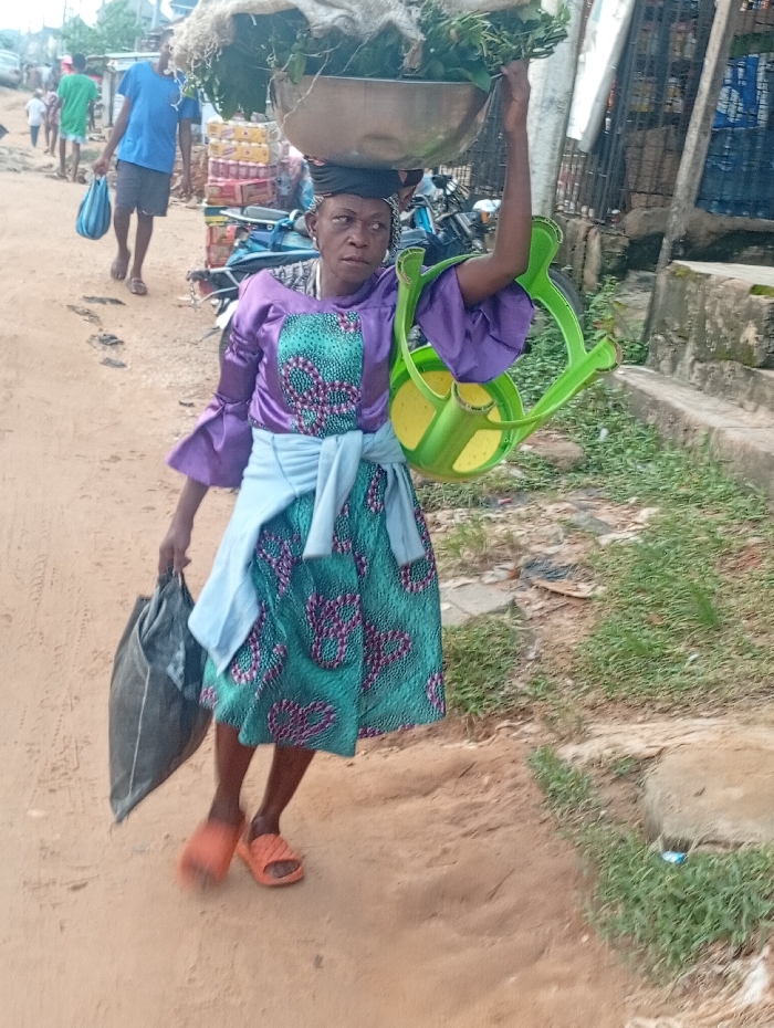 A middle-aged woman walks on an unpaved, reddish-brown dirt road in a commercial or residential area of Aba, Nigeria. She is positioned slightly right of the frame's center, moving towards the right. She wears a purple long-sleeved top with a patterned teal and purple skirt, secured by a light blue fabric tied around her waist, and orange slides on her feet. A large metallic bowl filled with green leafy vegetables is balanced on her head, stabilized by a dark headwrap. Her left arm is raised, holding a bright green, circular plastic stool or chair. In her right hand, she carries a dark grey bag. Her gaze is directed slightly to her right. In the background, on the same dirt road, several other individuals are visible, including a man in a blue shirt and shorts carrying a light blue bag, walking away from the camera. To the immediate left of the main subject are stacks of packaged goods, indicating a market or shop setting, and a parked motorcycle. To the right, the dirt road meets a narrow grassy verge and a concrete curb, behind which stands a dark metal fence or gate. The scene is illuminated by diffused daylight.